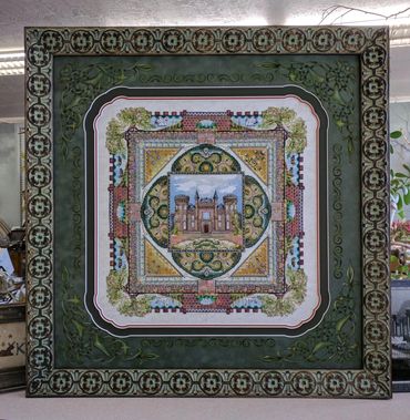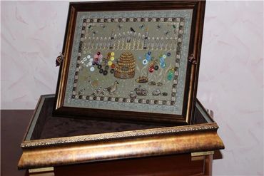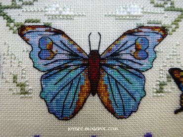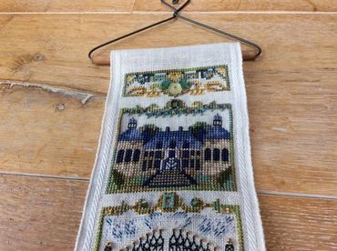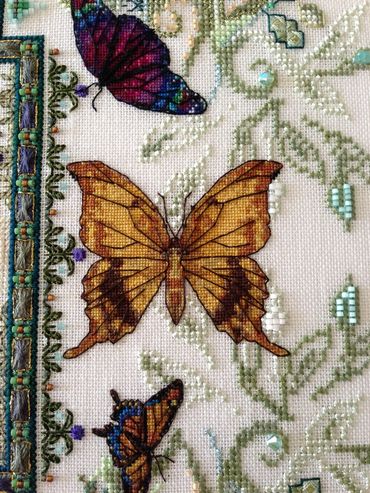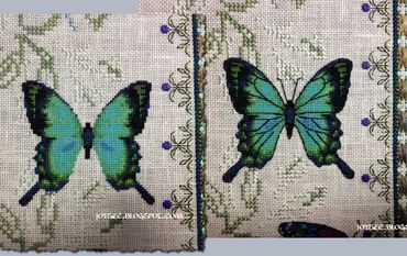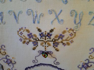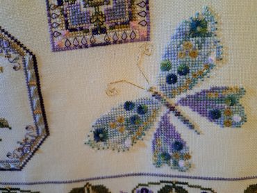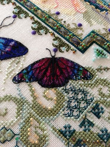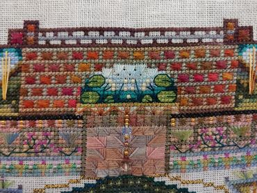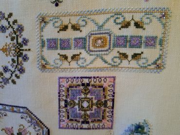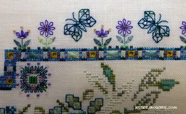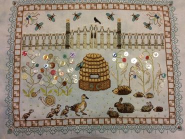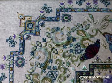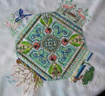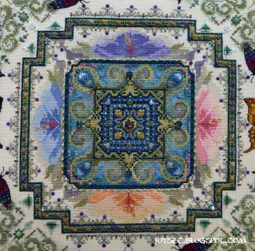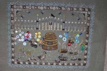 So this idea of a "Button Garden" came up and I dabbled along - until something in faded tones came to life - as a garden, brim-ful with Special Stitches in variegated pastel threads, and place for many beloved buttons in place of "flowers". I think who does not want to sew on buttons, can well use provided different sizes of Jessica and Rhodes "Rounds" to put in place of "buttons". Even the snails could get a house of a Mother of Pearl button instead of a stitched one...I will add a delicate lace frame outside of the ornate frame, which provides lots of "spaces" for your button collection...."