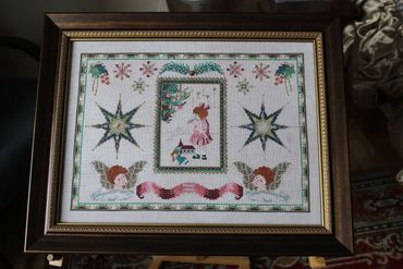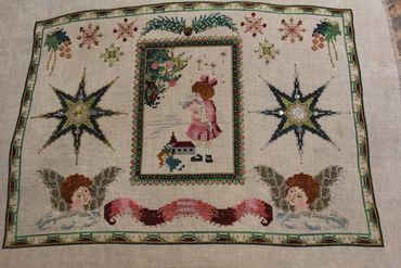 Clouds of snow and sparkling stars frame a view into a room, where a gentle Angel decorates the Christmas Tree with golden garlands. Slowly the snow is falling and shapes soft sparkling pillows alongside the weathered walls...."