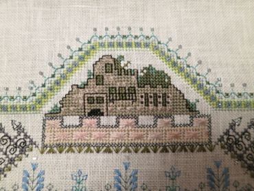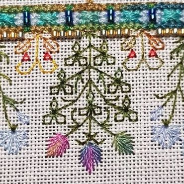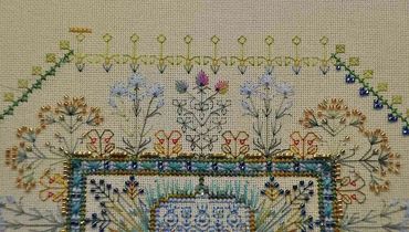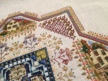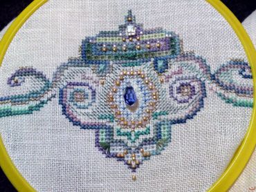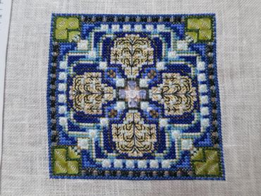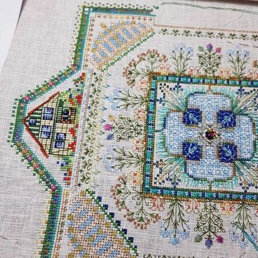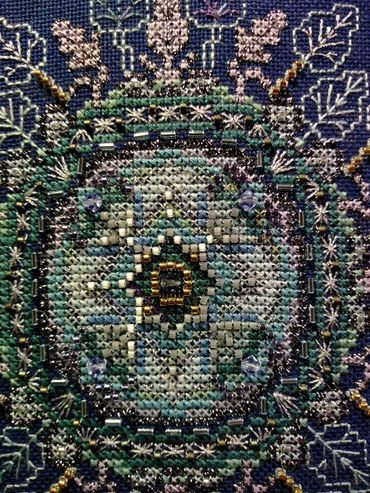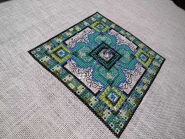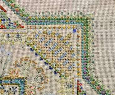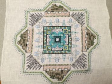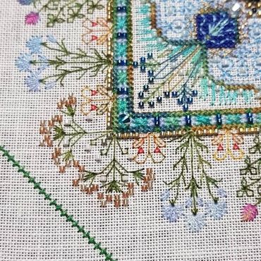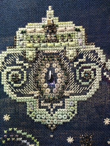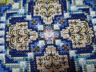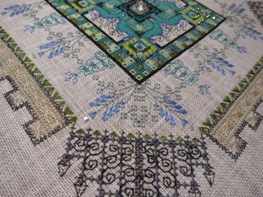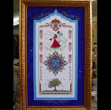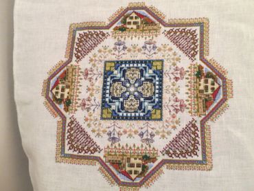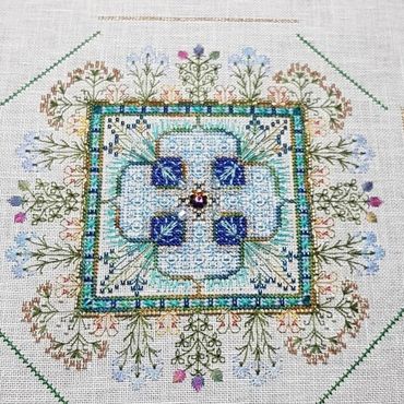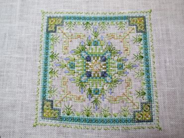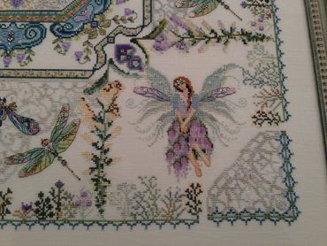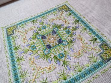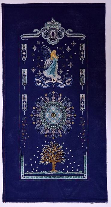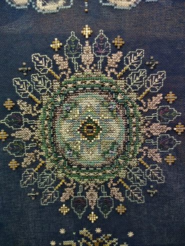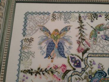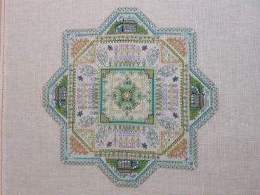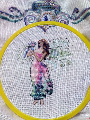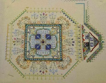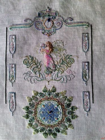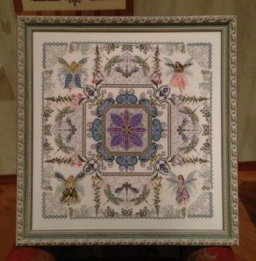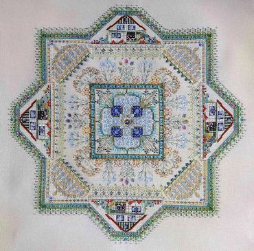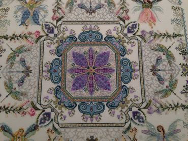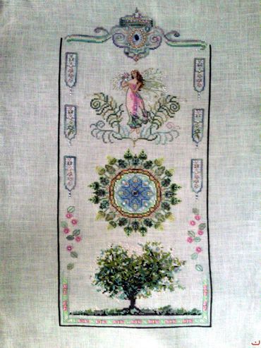 "Seeing the Fairies Mandala go made me somewhat sad - I so love Fairies as a theme, and Elves and the small folks. So the last sleepless night produced the first of the fragile persons - the Apple Blossom Fairy - the first in a series of Seasons' Fairies. They will be stitchable as a sort of band sampler with motives, ornaments and such- not in a Mandala.