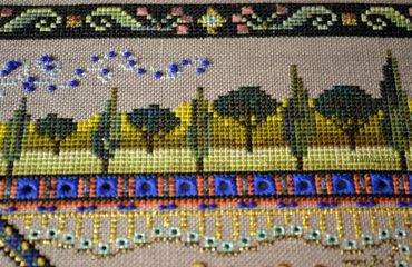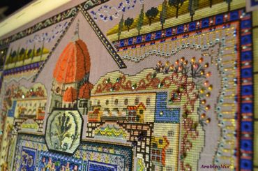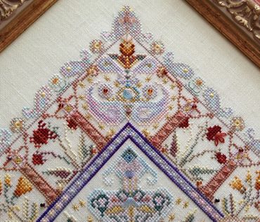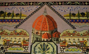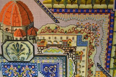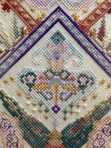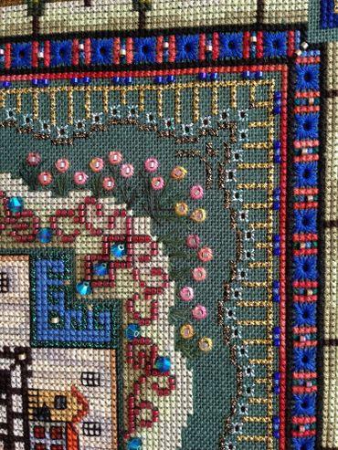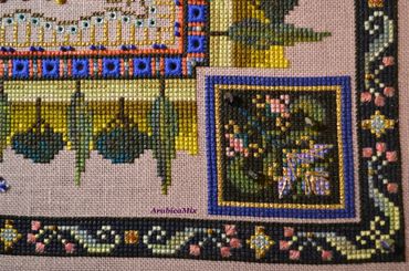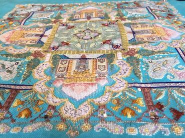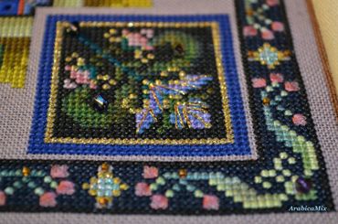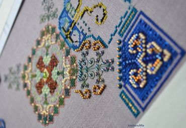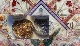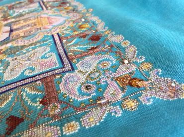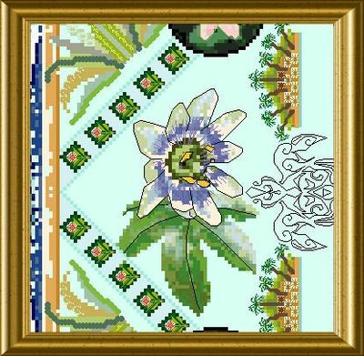 Lots of flowers like Heliconia, Hibiscus, Anthurium and Passiflora. Tiny Mantas, beaded as well as beautiful shells in different colors frame the outer parts of the sea like a lagoon. The pearls in the pearl shell can be stitched with beads -- or you splurge and sew on some pearls from your various strands of Tahiti Pearls (grin)"