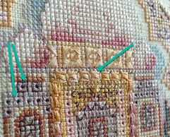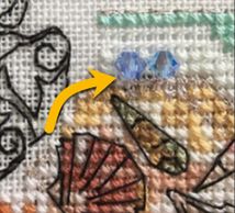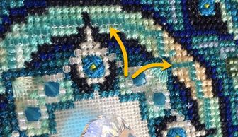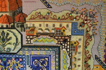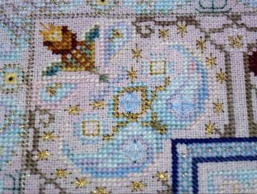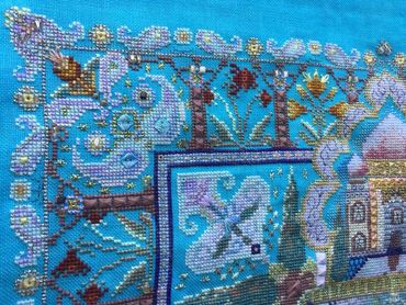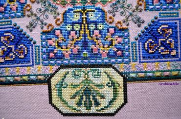 More inside you have tiny islands with palm trees.... there will be more shells, with PEARLS.....You will see wonderful flowers of this Island and a turtle which is created from Blackwork, using a traditional Tattoo as inspiration.....You will see motives of traditional Quilts as well as the decorative green ankle-adornments of the dancing women. In the center you have a piece of the Sea again, inspired by a Tattoo, embellished with lots of b e a d s and Sparklies - and framedby Tiaré Medaillions.